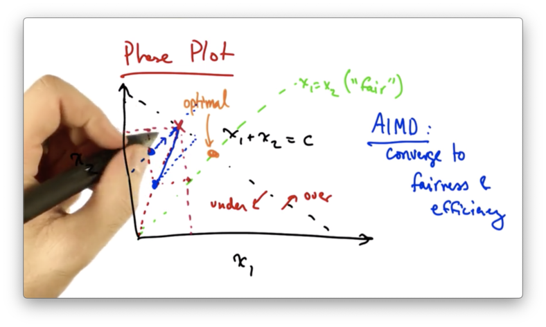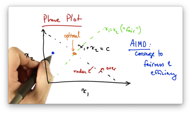 We can use this phase diagram to understand why senders who use AIMD converge to the optimal operating point.