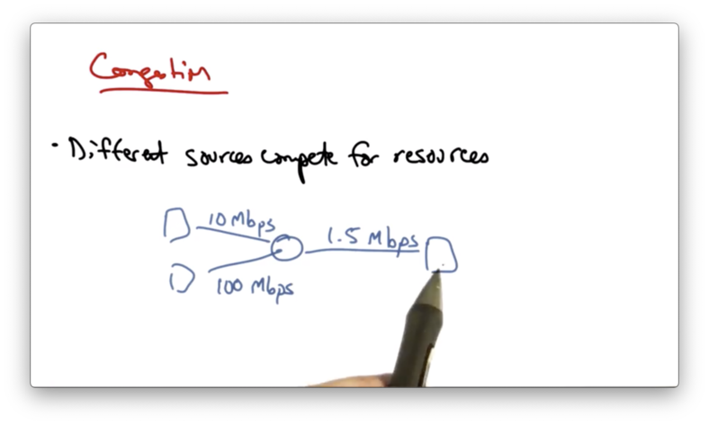 The two senders on the left can send at rates of 10Mbps and 100Mbps, respectively. The link to the host on the right, however, only has a capacity of 1.5Mbps.