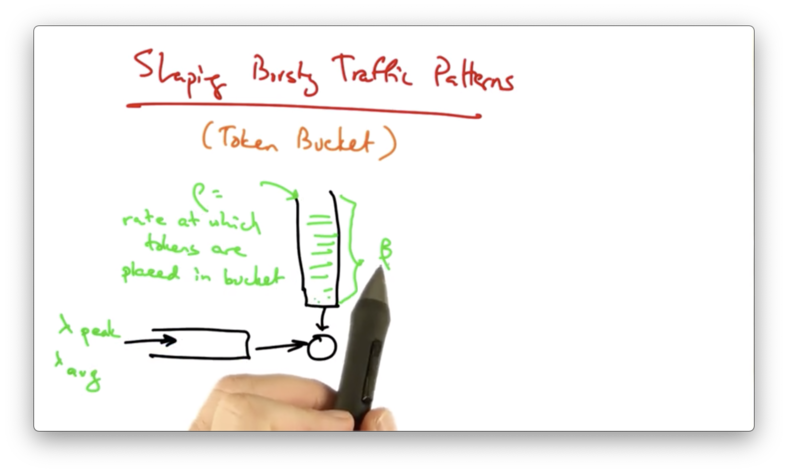 In a token bucket, tokens arrive in a bucket at a rate $\rho$. Again, $\beta$ is the capacity of the bucket. Traffic may arrive at an average rate and a peak rate.