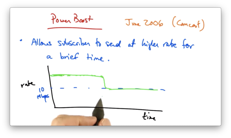 For example, if you subscribed at a rate of 10Mbps, power boost might allow you to send at a higher rate for some period of time before being shaped back to the rate at which you subscribed at.