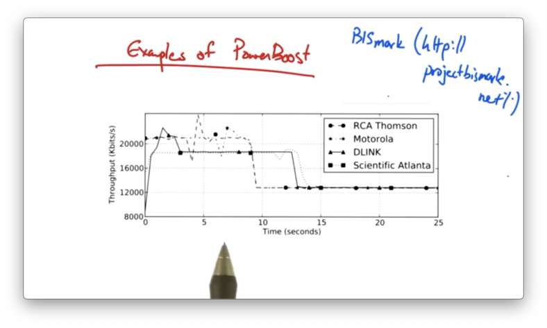 Here is a graph (courtesy of the BISmark project) measuring the power boost experienced by four different home networks - each with a different cable modem - connecting through Comcast.
