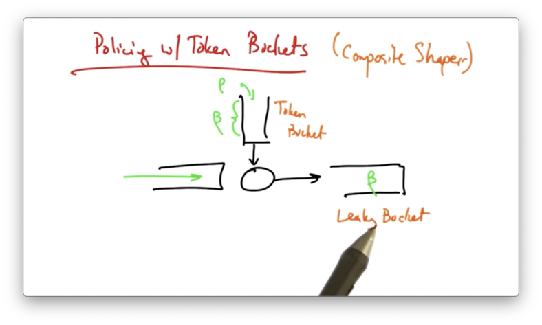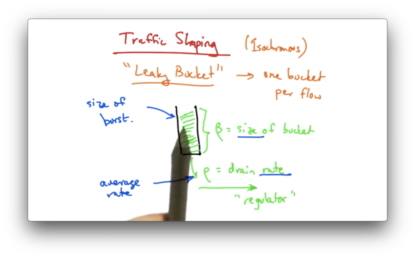 In a leaky bucket traffic shaper, traffic arrives in a bucket of size $\beta$ and drains from the bucket at rate $\rho$. Each traffic flow has its own bucket.