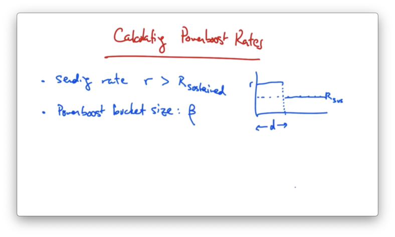Suppose that a sender is sending at some rate R which is greater than their subscribed rate r. Suppose as well that the power boost bucket size is $\beta$.