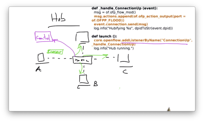 When the controller starts, it adds a listener that listens for a ConnectionUp event which is a connection from a switch. When the switch connects, it sends an OpenFlow flow modification back to the switch that says flood all packets out every output port.