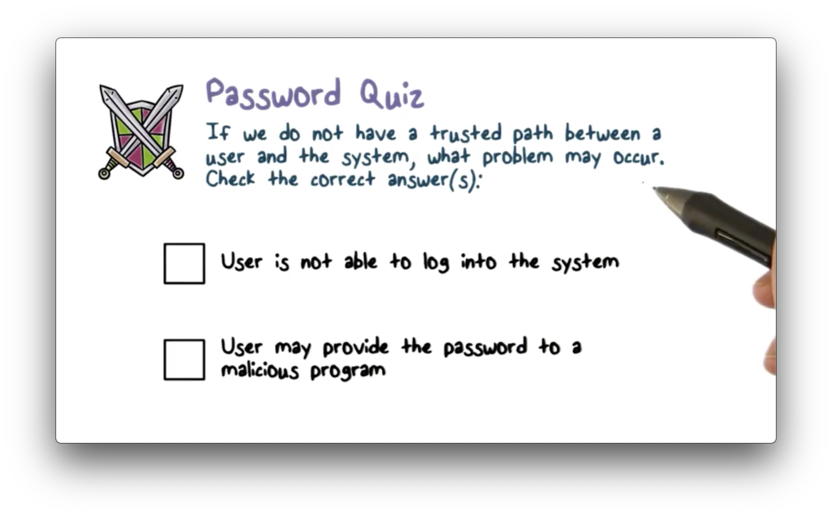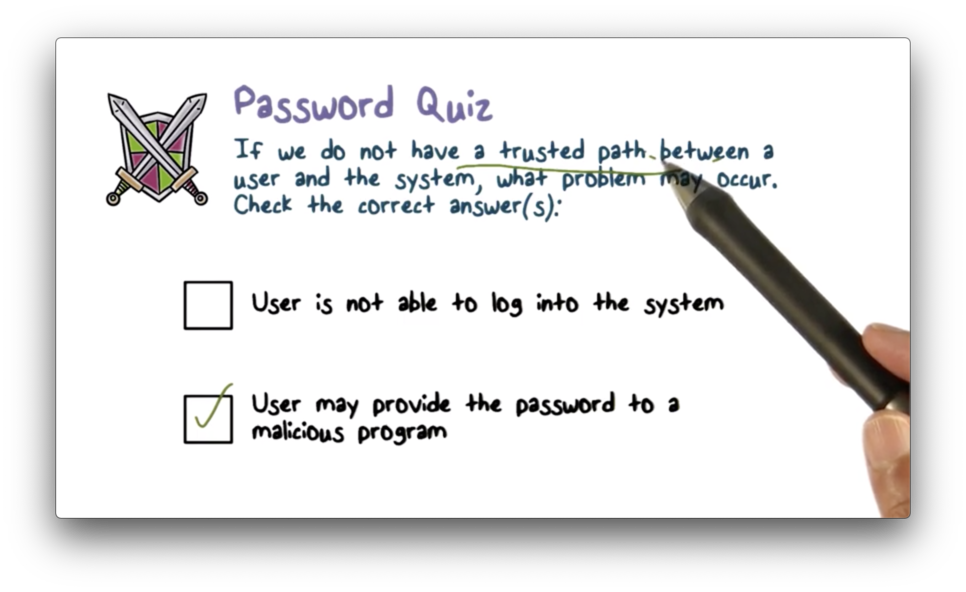Even with strong passwords, there are problems that are related to the trusted path. When a system asks you to authenticate yourself, how do you know the system is not being impersonated? Phishing and social engineering attacks arise from users not authenticating the entities trying to authenticate them.