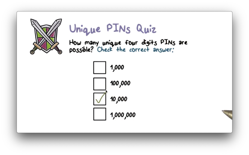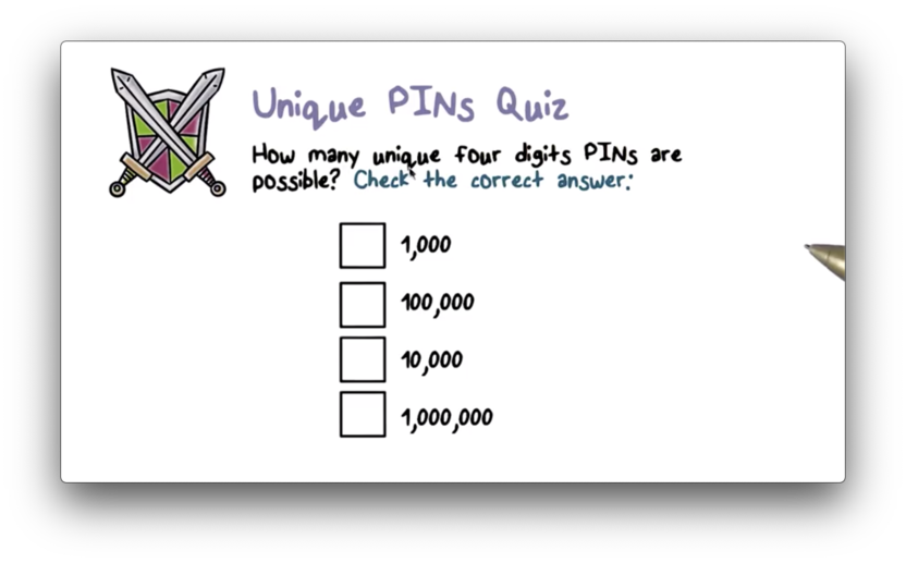 With ten options for the first digit, ten options for the second digit, and so on, the total number of four digit pins is 10 10 10 * 10, or 10^4, or 10,000.