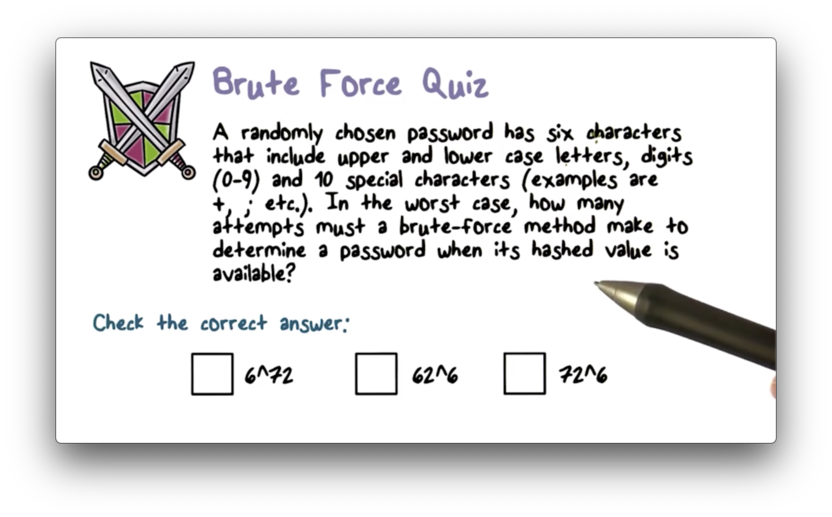 If we increase the size of the password to eight random characters, the space grows from 62^6 to 62^8, increasing the computation time from ten minutes to about twenty-five days.