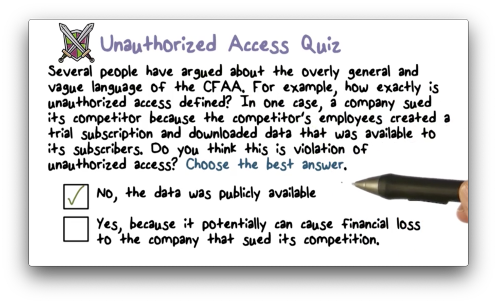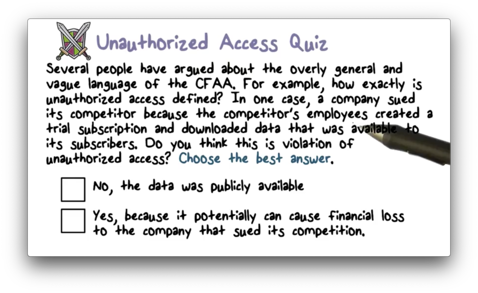 Initially, the CFAA only covered access to computers containing information related to national security and defense. Later, the CFAA extended its scope to include computer systems containing financial information, as many people care about the safety and security of their money. More recently still, the CFAA broadened its scope even further to cover any protected computer: any computer connected to the Internet.