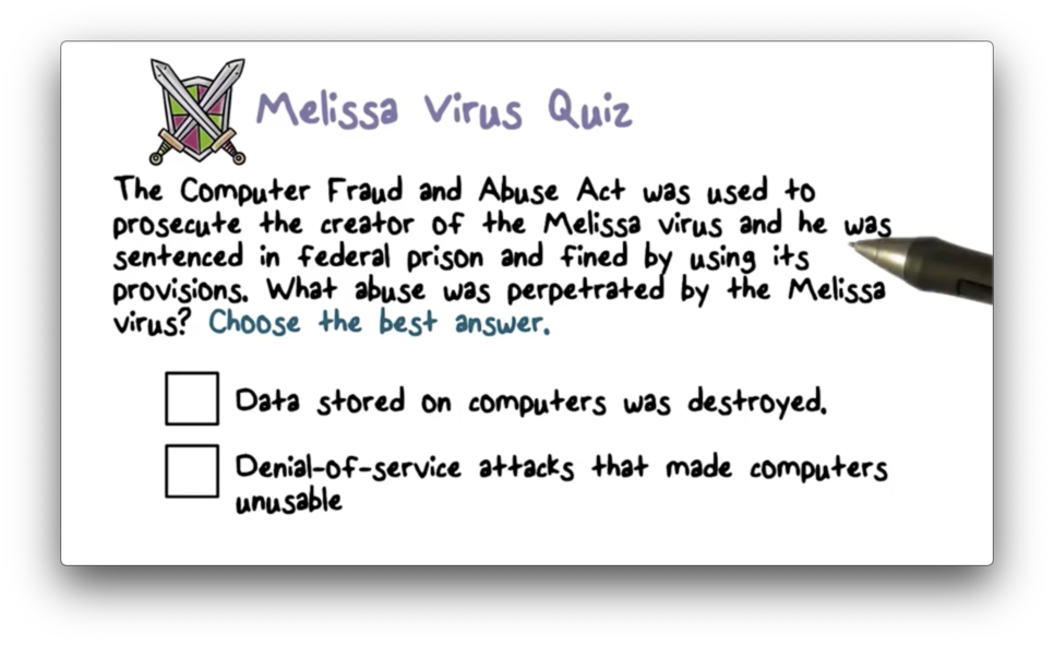 The first U.S. law related to cybercrime and illegal online activities is the U.S Computer Fraud and Abuse Act (CFAA). The goal of this act was to define what types of online actions constitute criminal activity and then outline sanctions against those actions.