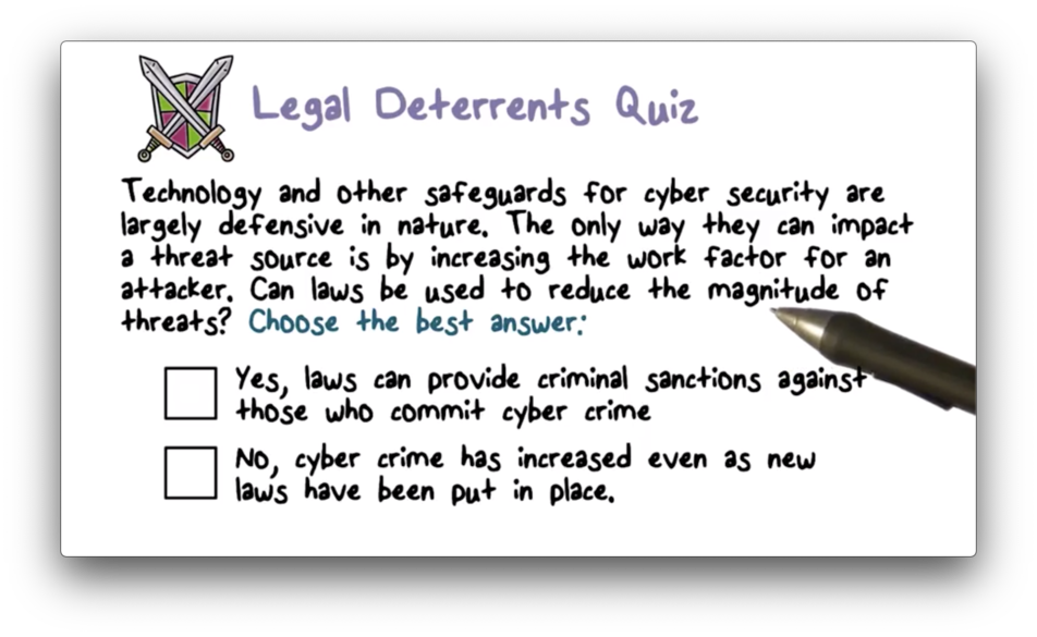 Additionally, lawmaking is a slow process, and the stakes are high for focused attackers. As a result, cybercriminals evolve quickly and continue to work around the laws that we put in place. Technology and creativity proceed more quickly than legislation.