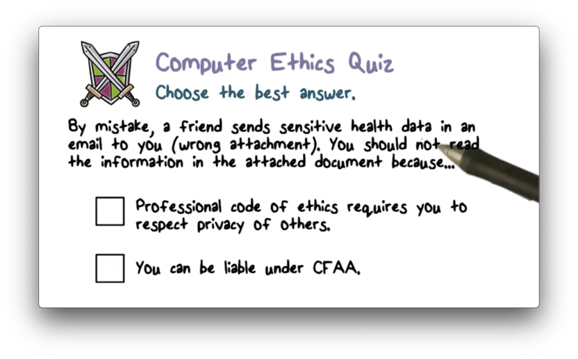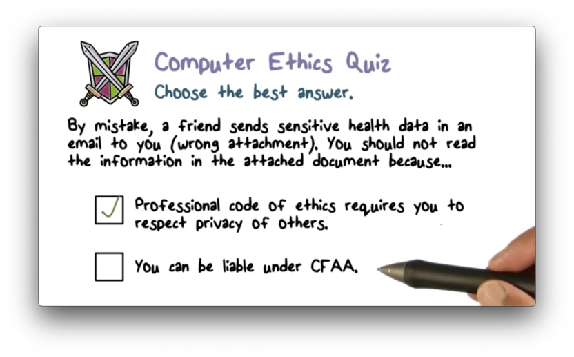 Ethics are much more personal and help guide our actions based on an internal sense of right and wrong. Something that feels ethical to you might not feel ethical to me. Organizations that we join - ACM, IEEE, or Georgia Tech, for example - may have additional ethical standards or codes of conduct by which they ask us to abide. We stick to our ethics not for fear of going to jail, but rather because they outline what we perceive to be right and appropriate in the world.