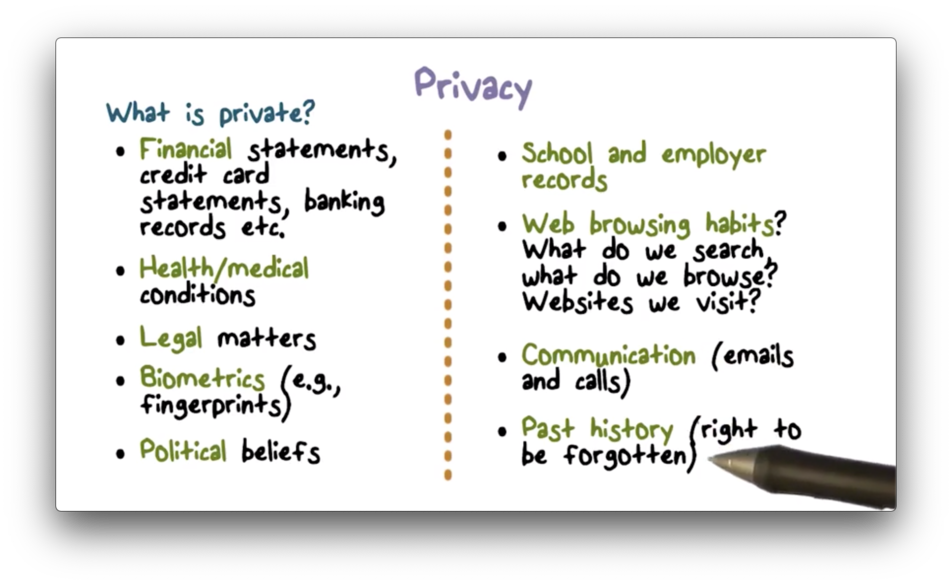 A third area we can think about is our privacy as Internet users. We spend a lot of time online, visiting different websites, using different services, and searching for different things. It's very easy for entities that we interact with digitally to collect a lot information about us. A lot of people worry about the concept of Big Brother watching everything they do, and would like some protection.