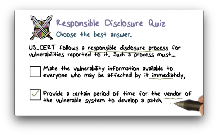 Consider finding a vulnerability in a widely-used software product. What is the ethical disclosure of this vulnerability? On the one hand, public disclosure alerts attackers to the vulnerability. On the other hand, deciding not to disclose the vulnerability removes any motivation for a vendor to fix it. That being said, attackers may have discovered the vulnerability already, so a public disclosure may inform users that they should stop using the software, at least until a patch is out.