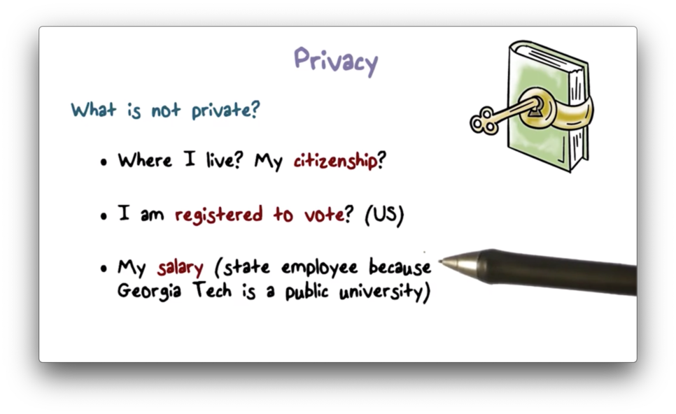 Finally, it may be possible for others to infer information about us, even if they don't possess it directly. For example, when we talked about database inference attacks, we discussed how different data setups, combined with public information an attacker already has, make it easy to de-anonymize data about specific individuals. In the world of big data and data mining analytics today, these inferences are becoming more common.
