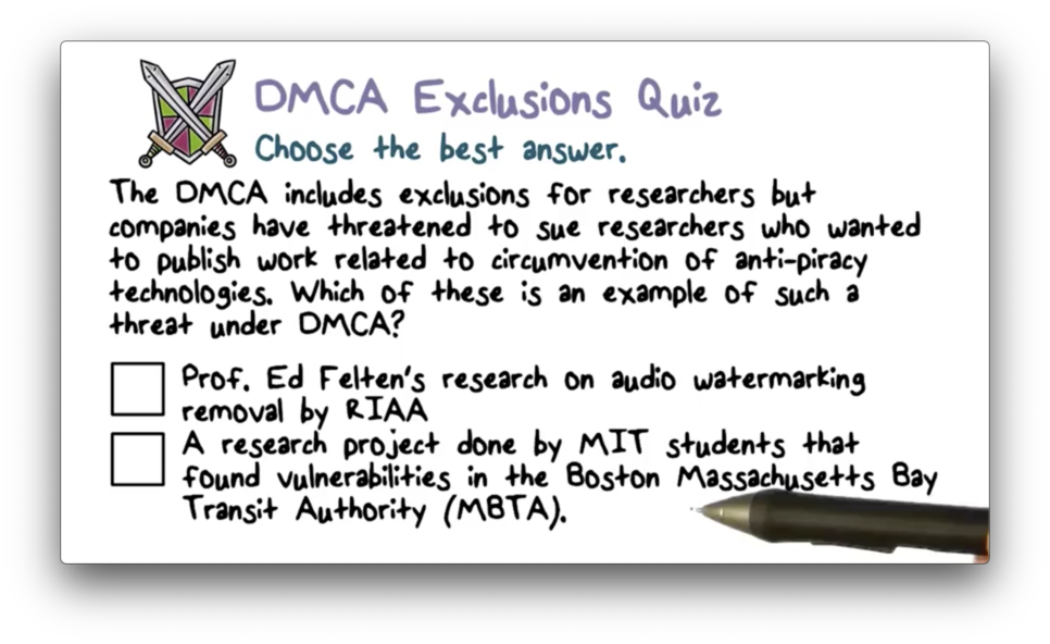 The Digital Millennium Copyright Act (DMCA) concerns intellectual property and digital content. The problem it helps to address is piracy - the illegal copying and theft of digital objects.