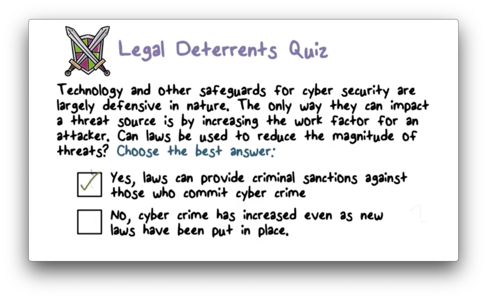 For example, consider cybercrime. We know that things like theft and extortion are illegal in the physical world. We've discussed similar activities that take place in the digital realm, such as data theft, identity theft, and ransomware. Thankfully, there are laws that offer us protection against cybercrime just as there are laws that protect us from "real" crime.