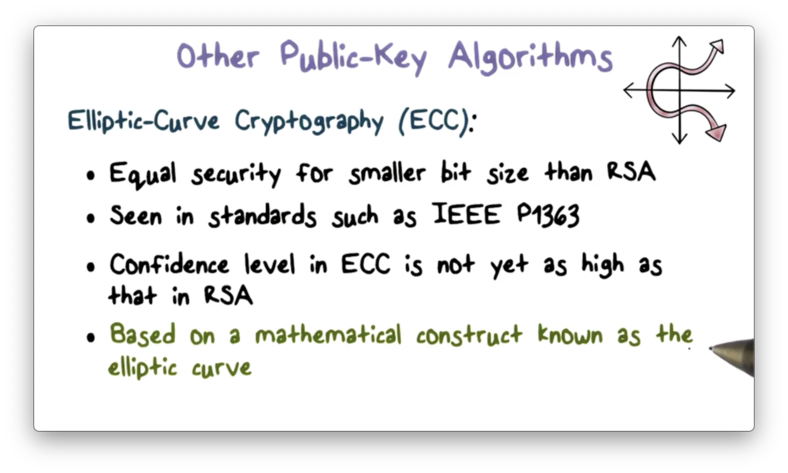 While RSA is the most widely used public-key algorithm for encryption and digital signature, a competing system known as Elliptic-Curve Cryptography (ECC), has recently begun to challenge RSA. The main advantage of ECC over RSA is that it offers the same security with a far smaller bit size.