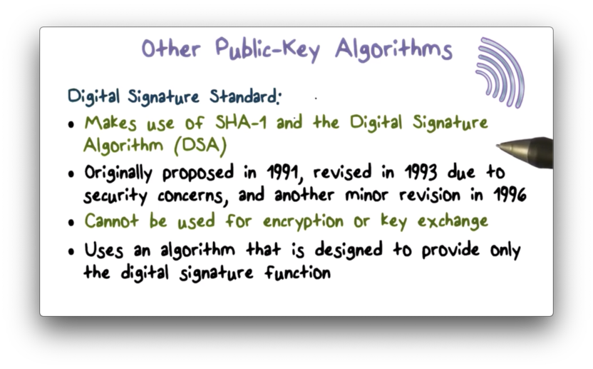 The Digital Signature Standard (DSS) is based on the secure hash function SHA-1. This algorithm is only used for digital signature, not encryption or key exchange.