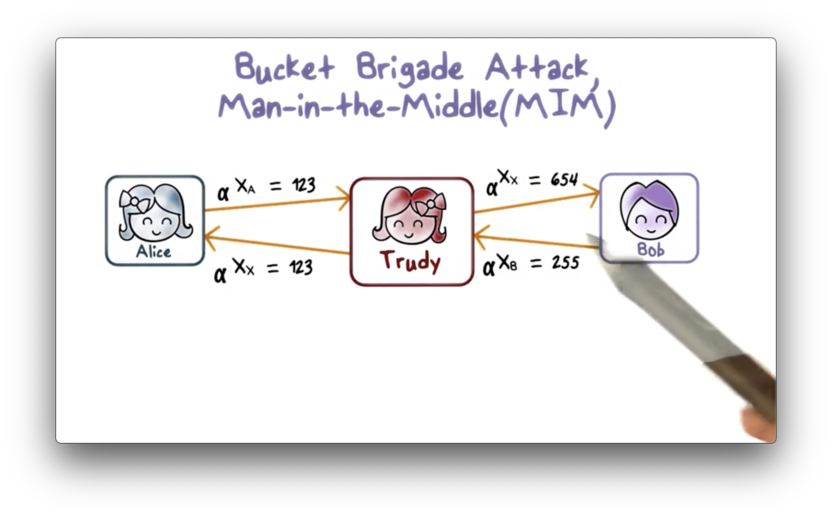 This man-in-the-middle attack is possible because the Diffie-Hellman key exchange protocol does not authenticate Alice or Bob. There is no way for Alice to know that the message that she has received is from Bob, and vice versa.