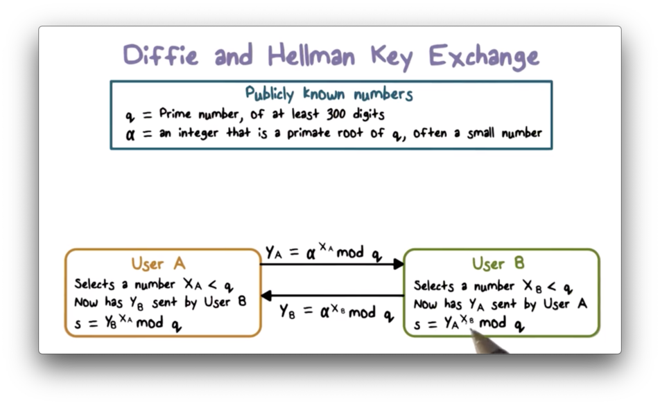 Upon receiving $Y_B$ from $B$, $A$ computes the key $k = {Y_B}^{X_A} \pmod q$. Similarly, $B$ computes the key $k = {Y_A}^{X_B} \pmod q$ upon receiving $Y_A$ from $A$. The expressions used to compute $k$ by each party are equivalent; that is, ${Y_B}^{X_A} \pmod q = {Y_A}^{X_B} \pmod q$. As a result of this exchange, both sides now share a secret encryption key.