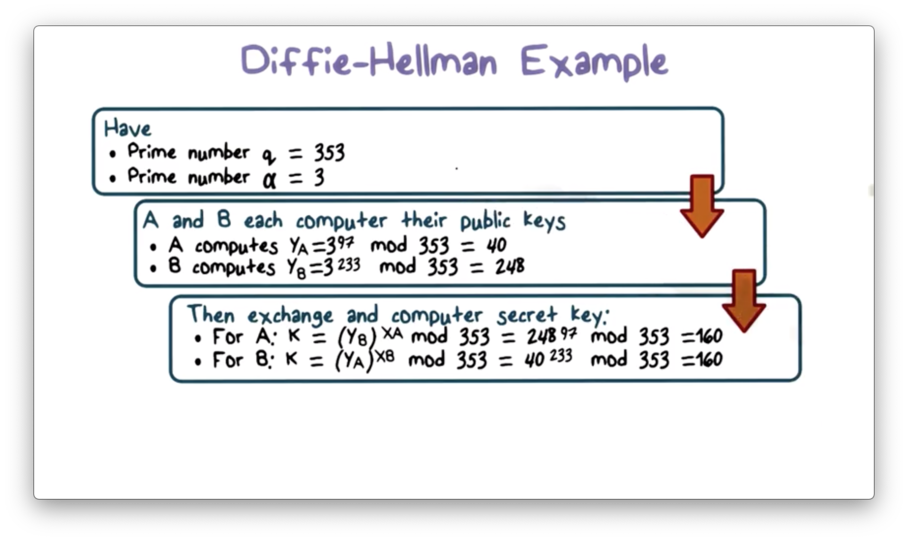 Upon receiving $Y_A$, $B$ computes $k = {Y_A}^{X_B} \pmod{353} = 40^{233} \pmod{353} = 160$. Similarly, $A$ computes $k = {Y_B}^{X_A} \pmod{353} = 248^{97} \pmod{353} = 160$. Through this exchange, both $A$ and $B$ have computed the same secret value, which they can now use to encrypt their communications.
