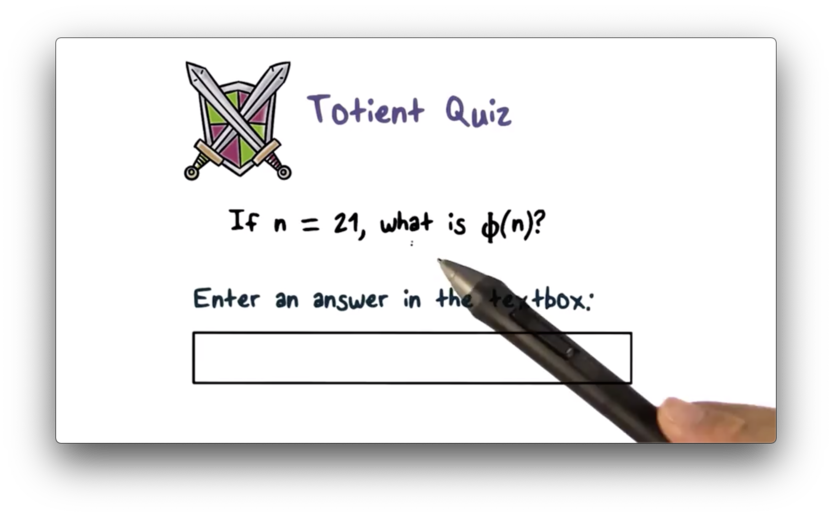 If $n = p q$ and $p$ and $q$ are prime, then $\phi(n) = (p - 1) (q - 1)$. For $n = 21$, $p = 3$ and $q = 7$, $\phi(n) = (3 - 1) (7 - 1) = 2 6 = 12$.