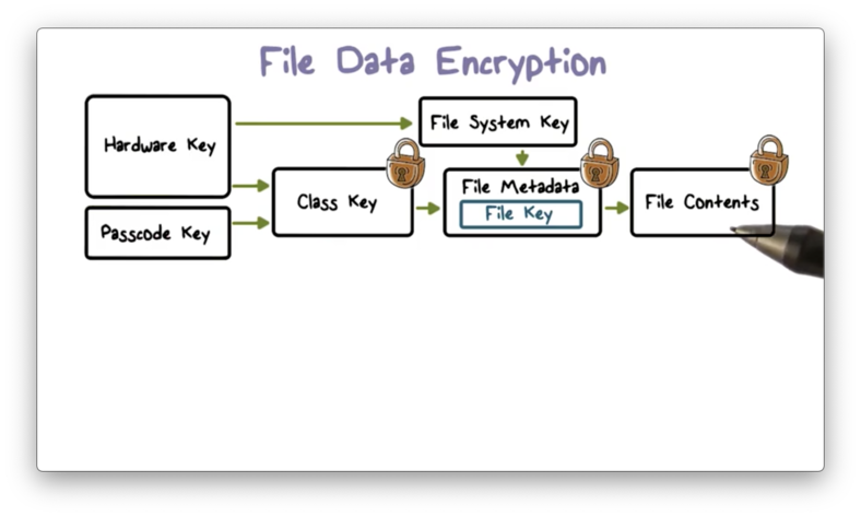 Data protection constructs and manages a hierarchy of keys - such as class, file, and filesystem keys - that builds on the hardware encryption technologies built into each iOS device.