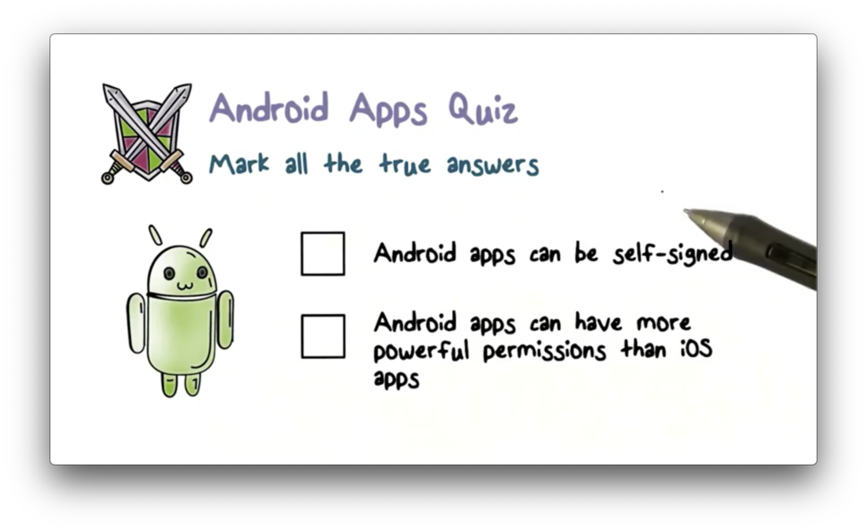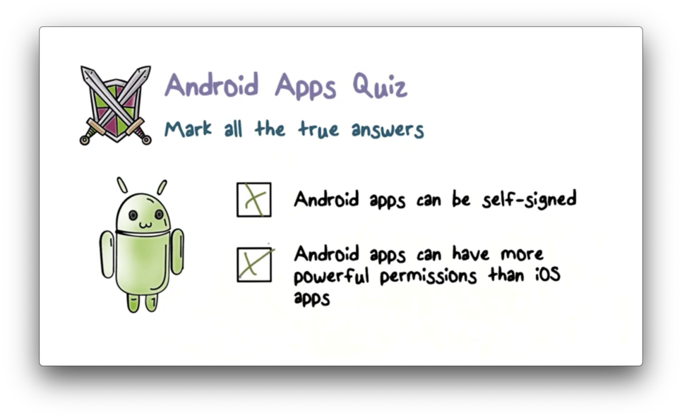 Android also takes a very different approach than iOS in terms of code signing. In particular, all Android apps are self-signed by developers. A developer can create a public key, self-sign it to create a certificate, and then use the key to sign apps.