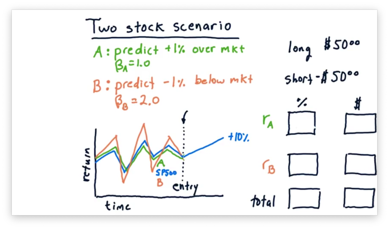 Suppose our hedge fund has done some research and they think that stock A is going to go up 1% over the market in the next 10 days; in other words, they are predicting an $\alpha$ of 0.01 for stock A. As well, they have used historical pricing information to observe a $\beta$ of 1.0 for stock A.