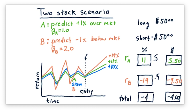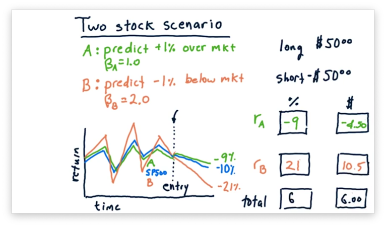 Consider the following scenario. Let's assume that the market stays flat, returning 0%, over the next 10 days and that we enter the following positions today: a $50 long position in stock A and a $50 short position in stock B. Let's also assume that our predictions are perfect. Stock A rises 1% above the market, and stock B falls 1% below the market.
