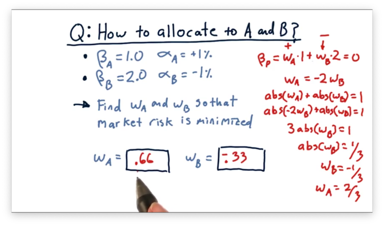 Let's look at our two stocks again. Stock A has a $\beta$ of 1.0 and an $\alpha$ of 0.01. Stock B has a $\beta$ of 2.0 and an $\alpha$ of -0.01. What should the weights be for stock A and stock B so that we can minimize market risk?
