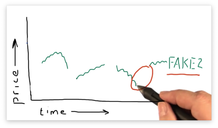 Suppose we were looking for patterns in the data, and we had rolled back time to step through the pricing data day by day. Let's suppose the current day we are examining is one of the points that we interpolated.