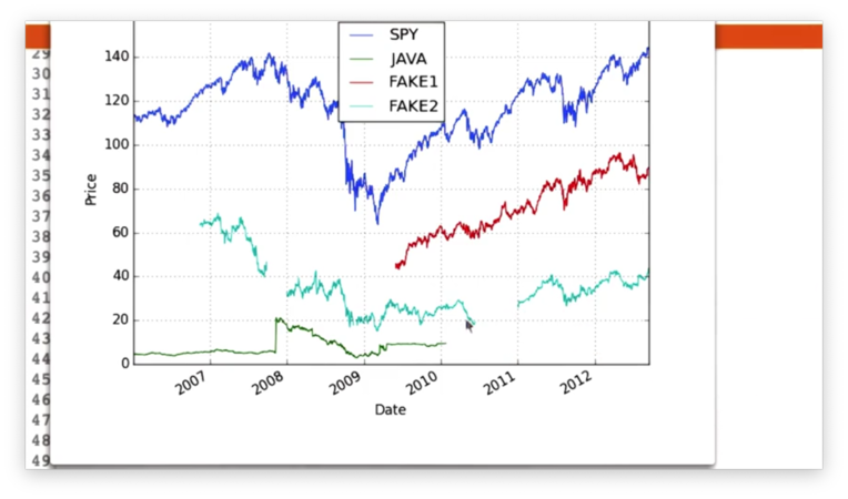 As you can see, FAKE1 didn't exist before a date roughly in the middle of our range. While we see NaN values after a particular date for JAVA, we see NaN values before a particular date for FAKE1.