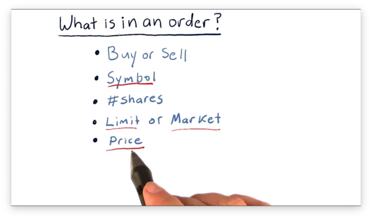 There are several components of a well-formed order. First, we need to indicate whether we are looking to buy or sell shares. Second, we need to specify the symbol of the equity that we are interested in - for instance, IBM or SPLV.