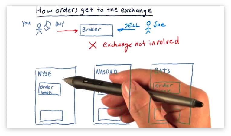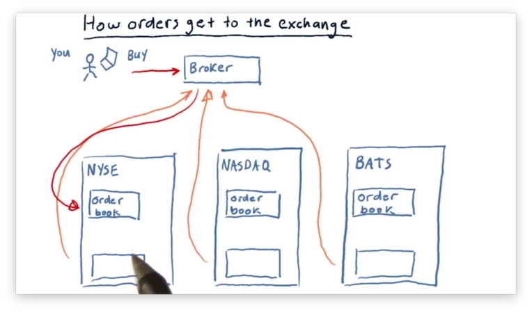 Suppose that we have just issued an order from our laptop to buy some stock. The buy order goes over the Internet to the broker, who is, in turn, connected to several exchanges - NYSE, NASDAQ, and BATS, for example.