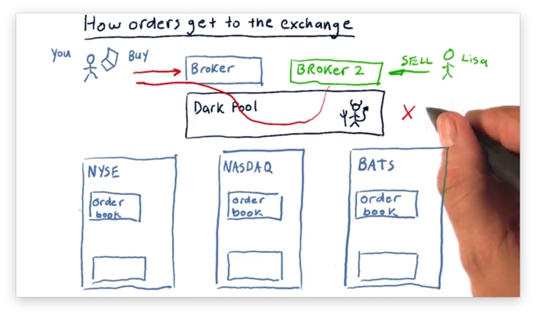 In this example, Lisa's sell order might be routed from her broker through the dark pool to our broker and connect with our buy order without ever making it to the exchanges.