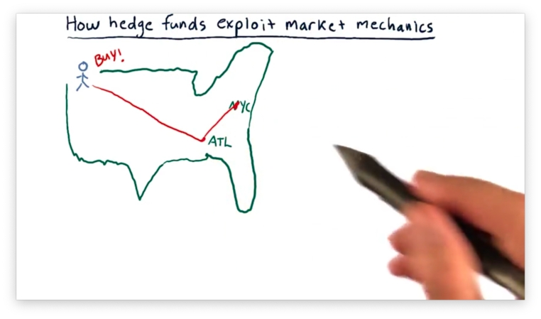Back in Seattle, Joe is thinking the same thing, so he enters a buy order, which starts making its way across the country. As his order travels, the price begins to rise as a result of the buy orders we submitted.
