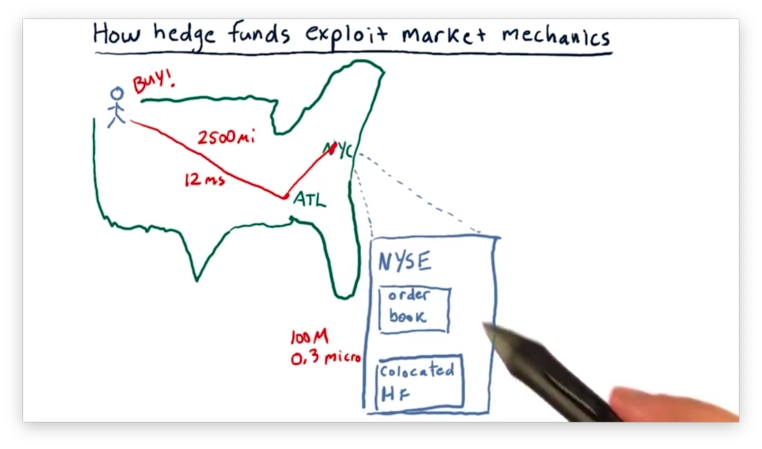 Suppose our hedge fund owns one of these colocated computers. This computer might sit 100 meters from the central exchange computer that holds the order book. Information about the order book travels from the exchange computer to our computer in about 0.3 microseconds.
