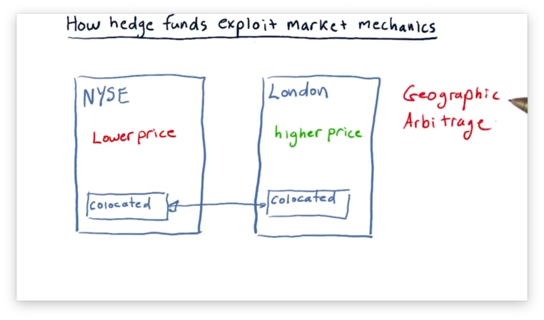 Consider two exchanges: one located in New York City and another located in London. Our hedge fund might place a server at each exchange and connect them with an ultra high speed, dedicated connection. The servers continuously monitor the order books at each exchange and compare prices.