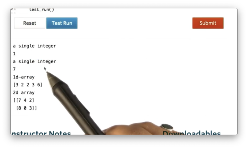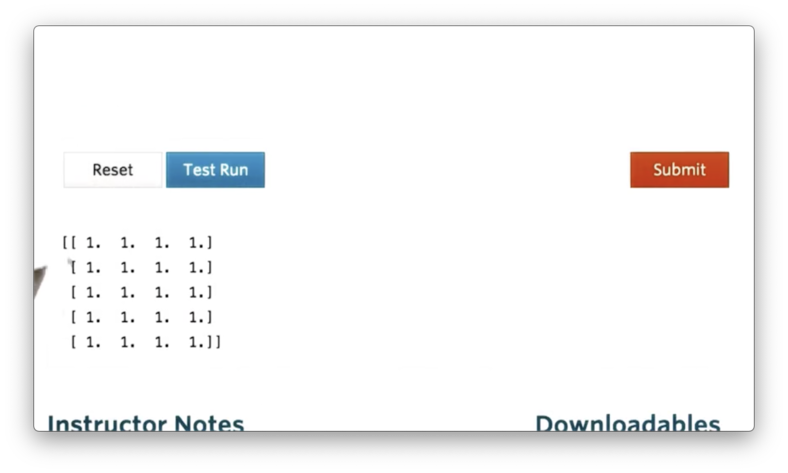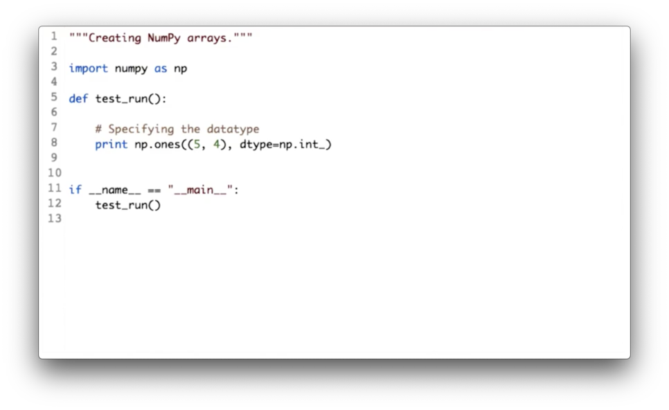 We saw that the elements in an array created by np.ones are floats by default. Our task here is to update the call to np.ones and pass in a parameter that tells NumPy to give us integers instead of floats.