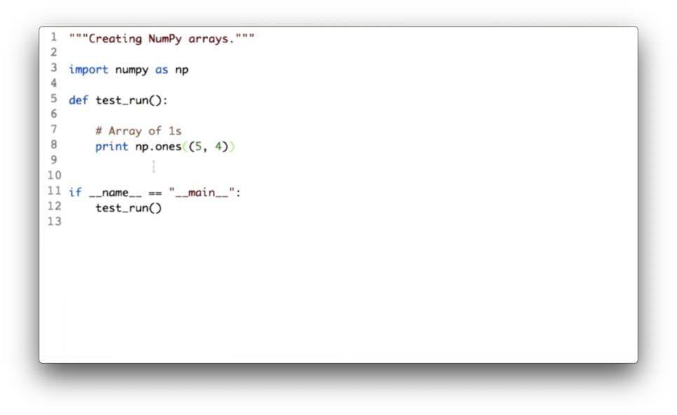 We can create an array full of ones with the np.ones function, and the following code shows how to create such an array with five rows and four columns: