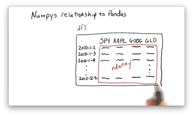 As the picture above illustrates, pandas builds df on top of an ndarray. We can retrieve the internal ndarray directly from a DataFrame df with the following code: