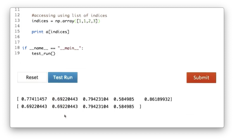 Indeed, we can see that our resulting array contains the elements of a at indices 1, 1, 2, and 3.