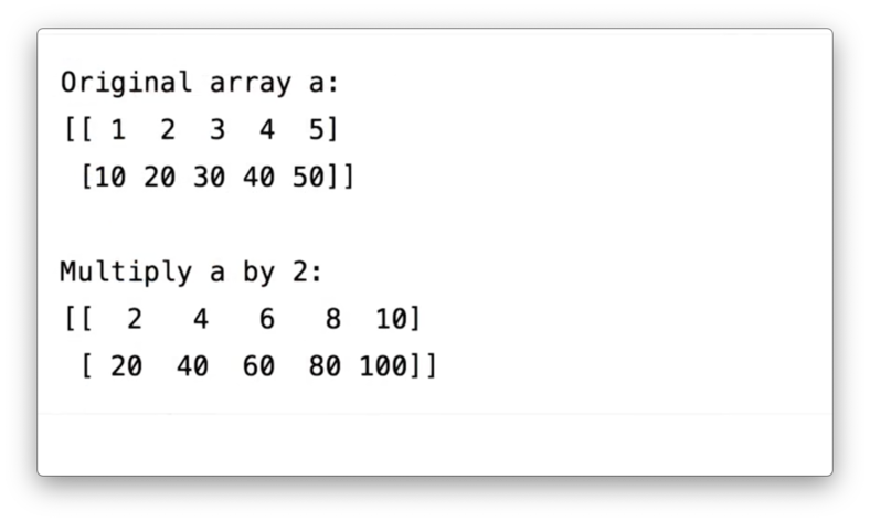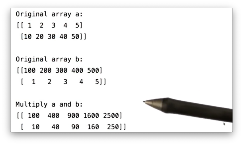 The multiplication operator allows us to multiply two ndarrays in an element-wise manner. Note that other languages commonly use the multiplication operator to signify the dot product. NumPy does not do this.