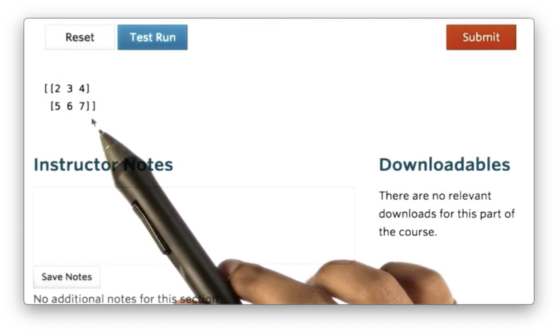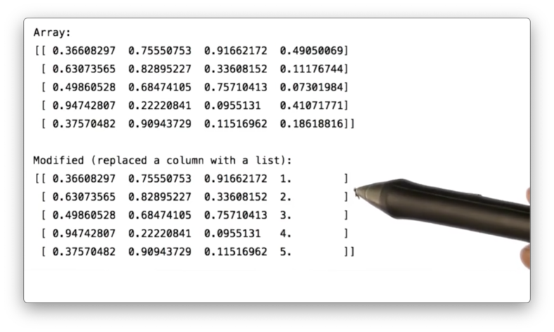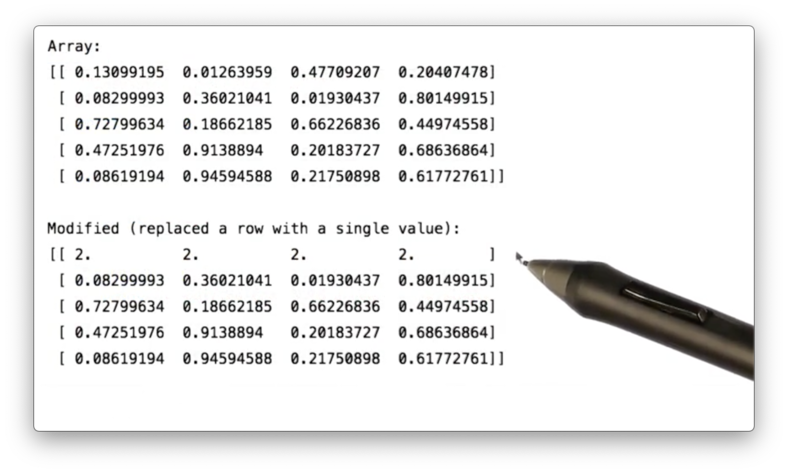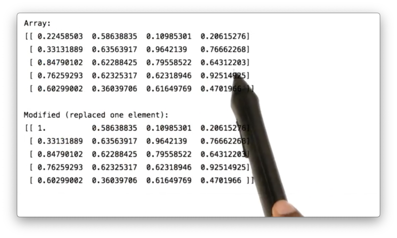 As well as accessing elements in ndarrays, we can also assign values to specific locations in ndarrays. As a simple example, we can set the first element in a to 1 like this: