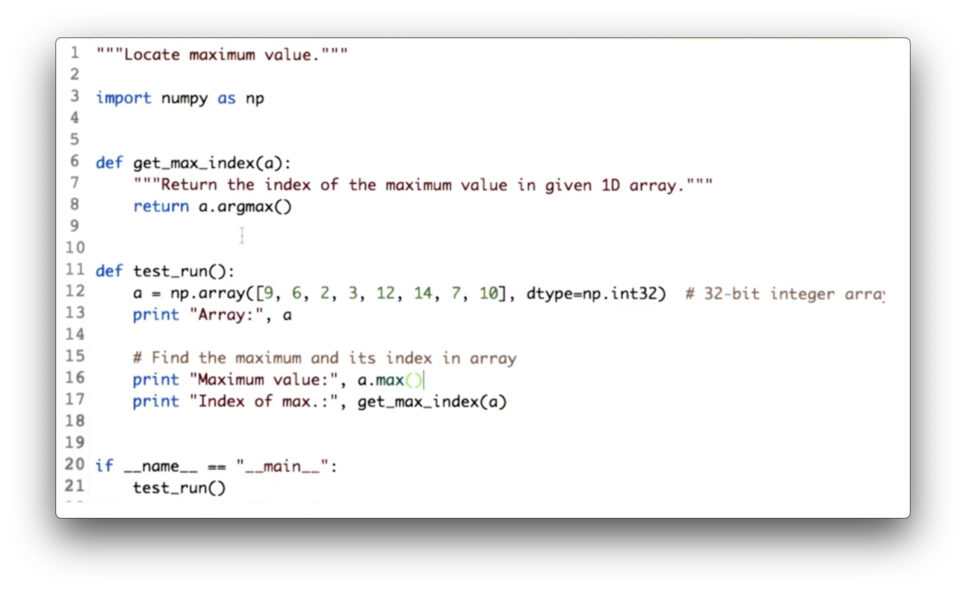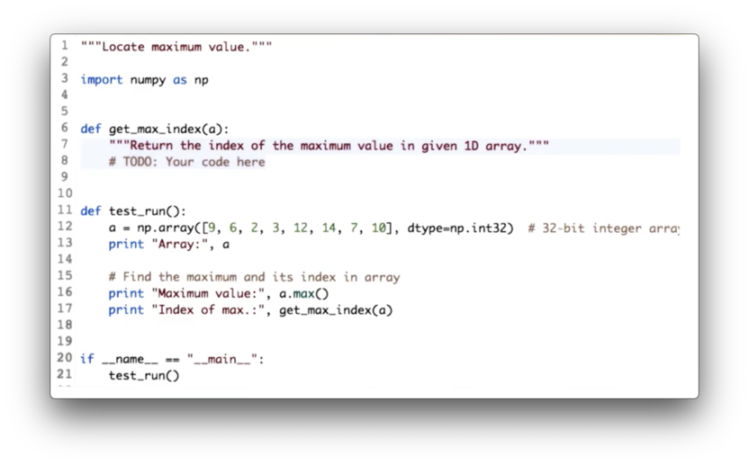 Our task is to implement the function get_max_index, which takes a one-dimensional ndarray a and returns the index of the maximum value.