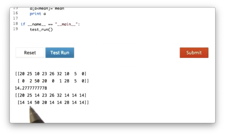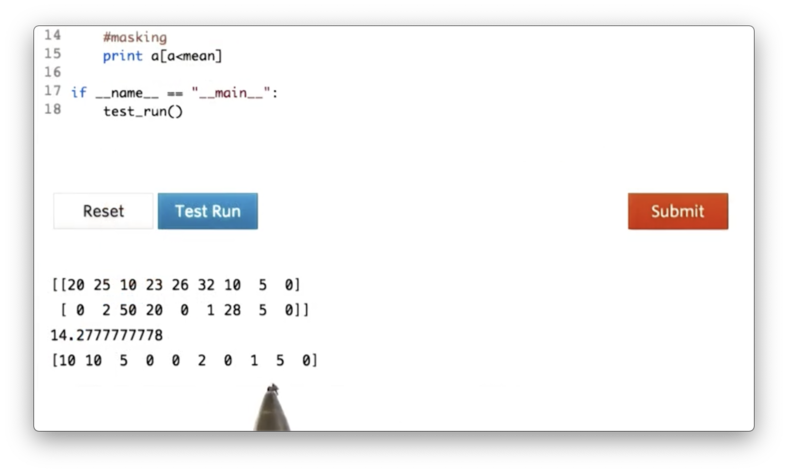 Let's see how we can retrieve all of the values from an ndarray that are less than the mean of that array. First, we construct our two-dimensional ndarray a and calculate the mean: