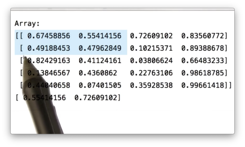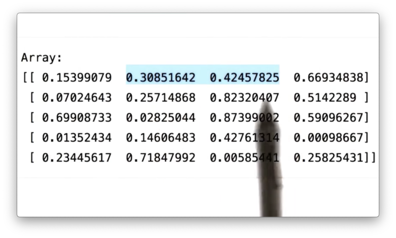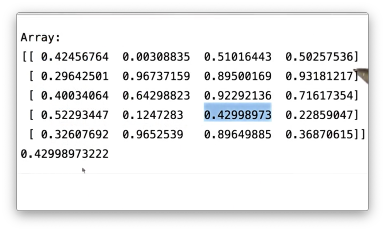 Accessing ndarray elements is straightforward. You can access a particular element by referring to its row and column number inside square brackets. For example, we can access the element in the fourth row and third column of a like so: