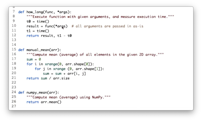 We claimed that NumPy is very fast, and we'd like to confirm this claim. To do so, we first need to understand how to time functions in general.
