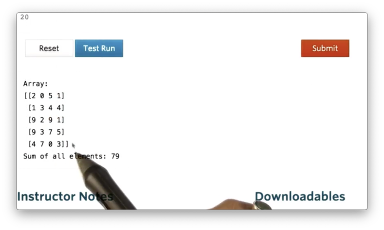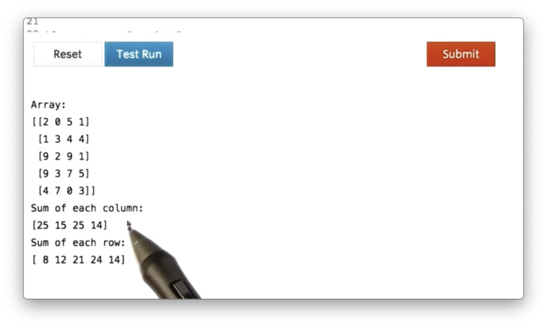 We refer to this "direction" as an axis. The rows of an ndarray are aligned along axis zero, and the columns of an ndarray are aligned along axis one. Thus, if we want to sum all of the rows, we must sum along axis one, and if we want to sum all of the columns, we must sum down axis zero:
